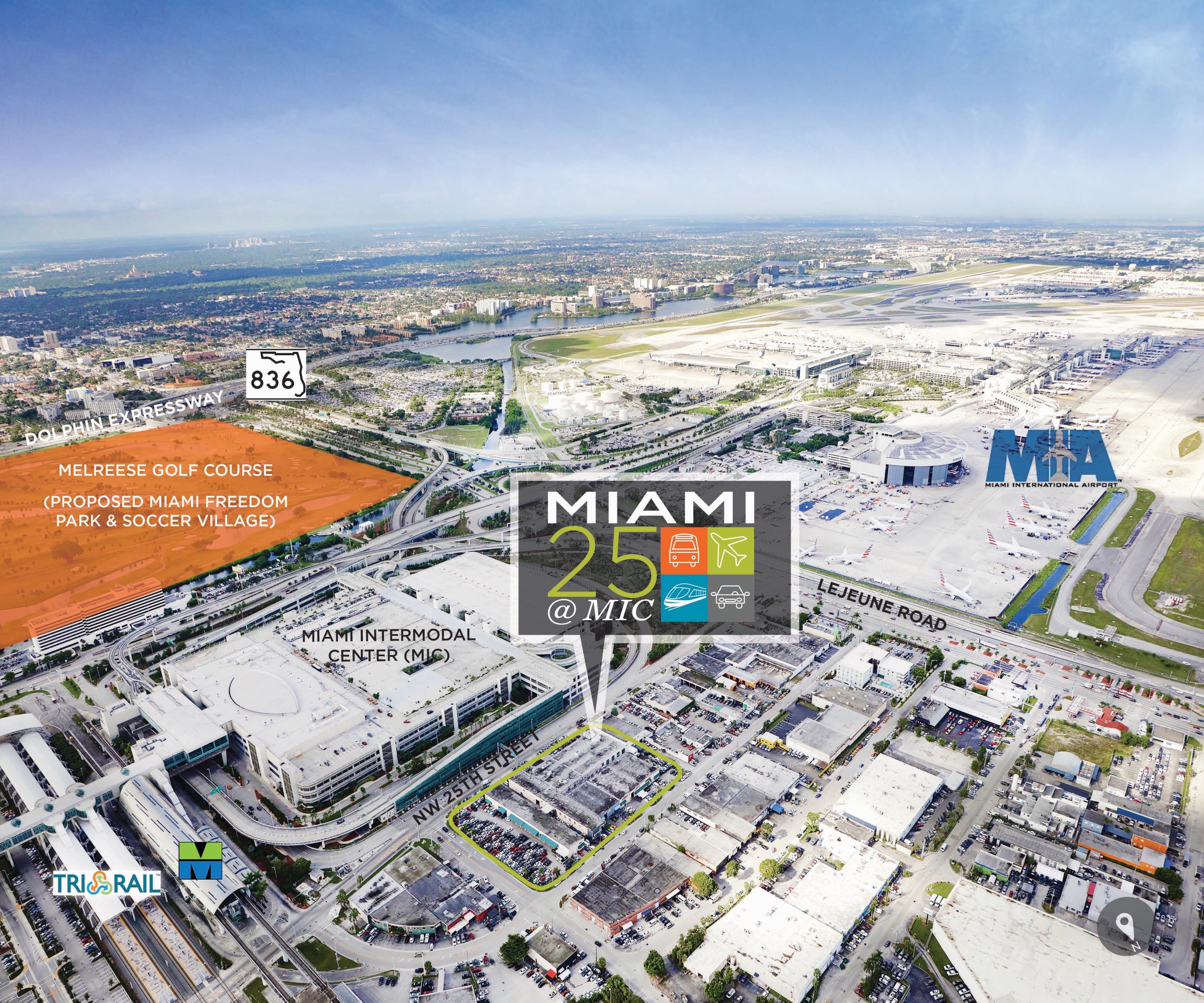 Miami 25 @ MIC is situated on a ±3.44 acre site at 3901 – 3977 NW 25th Street and 3900 – 3960 NW 26th Street in Miami. The property is strategically located across NW 25th Street from Miami Intermodal Center (MIC) and just east of Miami International Airport (MIA). MIC is a massive $2 billion multi-modal ground transportation hub developed by the State of Florida Department of Transportation. MIC encompasses Miami Central Station (MCS), a state-of-the-art facility connecting Tri-Rail, Metrorail, MIA Mover, Greyhound and local bus lines, and the Rental Car Center (RCC).